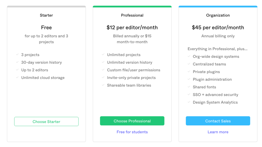 피그마는 기본적으로 혼자 또는 두 명까지 함께 사용하는 것은 실질적으로 무료로 제공하는 정책을 지니고 있다. 다만 팀 단위로 프로젝트를 운용하여 해당 팀의 인원수가 2명보다 많아지거나 프로젝트 단위를 여러 개 늘리고 싶은 경우에는 유료 모델로 전환이 필요하다. 하지만 앞서 밝힌 바와 같이 디자인 파일의 생성은 무료로 무제한으로 가능하며 기능의 제약 또한 없다. 피그마의 강력한 기능이라고 볼 수 있는 실시간 협업 기능을 2명이 넘는 인원과 사용하려면 유료 모델로 전환이 필요한 식의 비즈니스 모델을 지니고 있다. 이러한 경우는 특수한 프로젝트나 기업 단위의 업무 환경에서 주로 발생하며, 개인 단위로 사용을 하는 경우 무료로도 얼마든지 이용이 가능하다. 이는 스케치가 일 년 단위로 10만원 가량의 비용이 소요되는 것에 비해 굉장한 이점이라고 볼 수 있다.