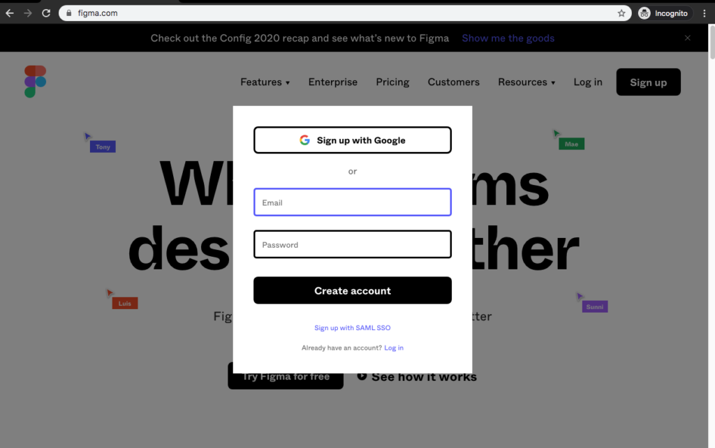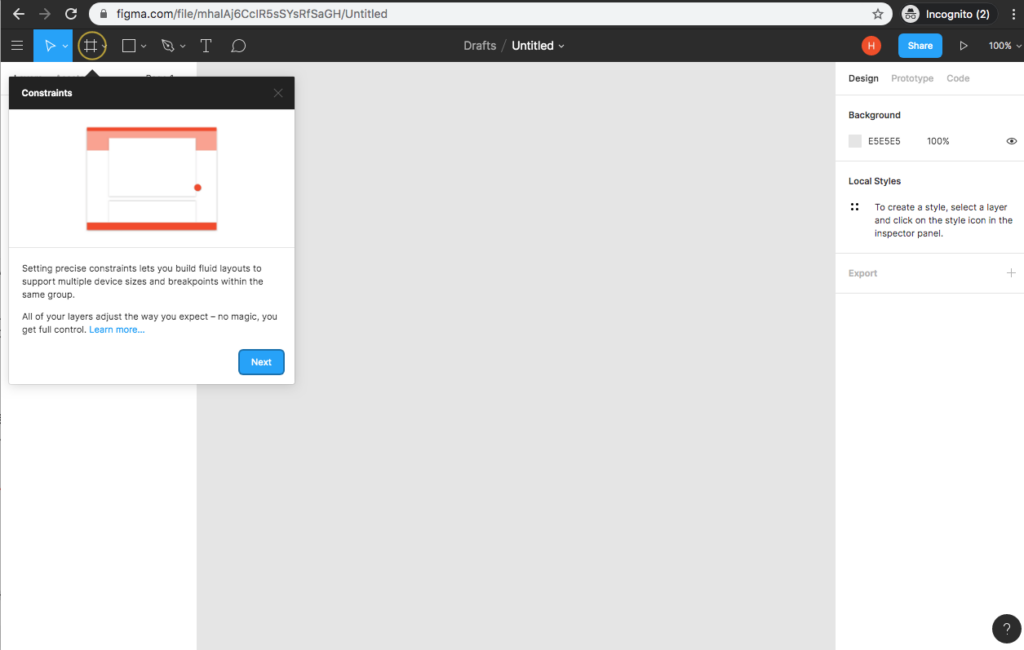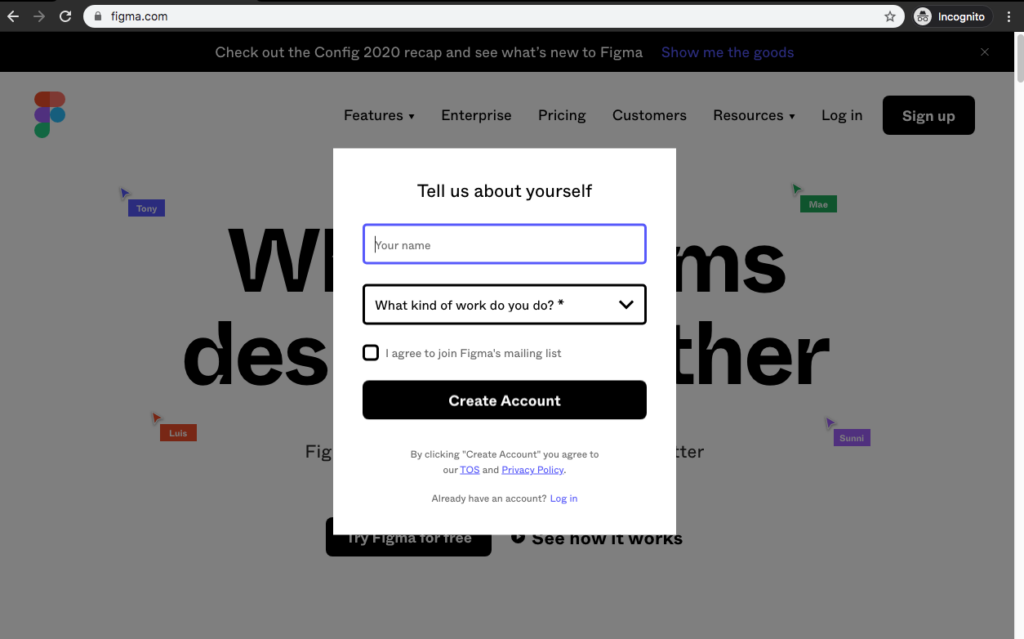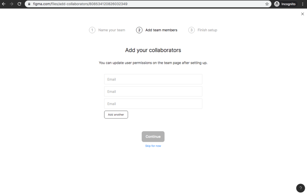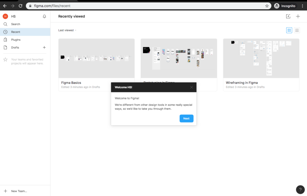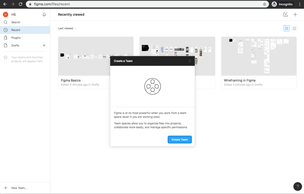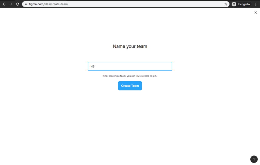 처음에 튜토리얼 팝업이 뜨는데 이를 ‘X’ 버튼을 눌러 종료하고 바로 좌측 Drafts 메뉴에 ‘+’ 버튼을 눌러 디자인 파일을 생성하여 작업을 시작할 수도 있다. 여기선 튜토리얼이 시키는 대로 프로젝트를 관리할 수 있는 팀을 만들어 보겠다.
