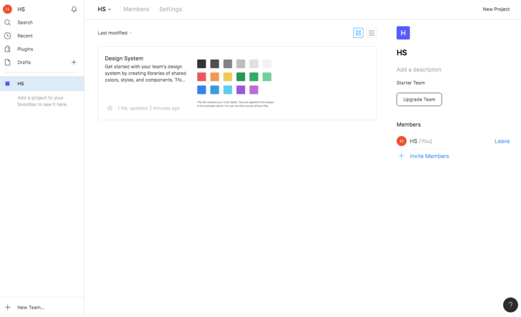 가운데에 팝업으로 튜토리얼이 생성되는데 팀을 만들라는 이야기이다. 혼자 작업하는 상황이라고 하더라도 프로젝트 별로 파일들을 나누어서 저장할 필요는 있기에, 임의의 팀명을 기입해서 팀을 만들기 바란다. 디자인 파일들이 소속되는 계층 구조는 여러 층위로 이루어져 있다. 윈도우의 폴더 생각하시면 될 것으로 보이는데, ‘팀 > 프로젝트 > 파일’ 이런 식의 계층 구조를 지닌다. 어느 프로젝트에도 속해 있지 않은 파일은 ‘Drafts’라는 일종의 임시 폴더에 저장이 된다. 팀을 만들지 않고서 Drafts만 이용하여도 무관하지만 추후에 파일 관리가 힘들어 질 수 있다.