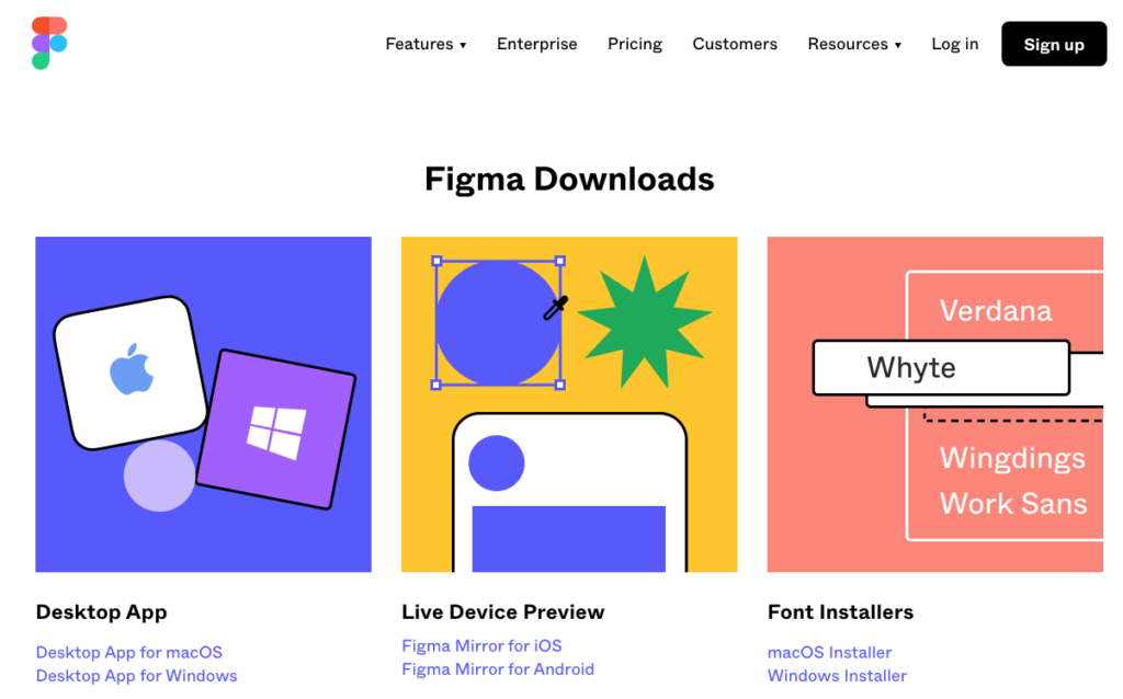 더불어서 지금 이 상황에서 계속 웹브라우저를 통해서 이용을 하실 수도 있으며 별도 전용 클라이언트를 다운로드 받아서 이용할 수도 있다. 이 경우 잠시 로그아웃을 한다음 피그마의 공식 홈페이지의 최하단에서 Downloads 메뉴를 찾아 다운로드 받고 사용하면 된다. 전용 클라이언트의 이점은 로컬폰트 로드 및 최적화 측면에서 이점이 조금 더 있다는 점이다.