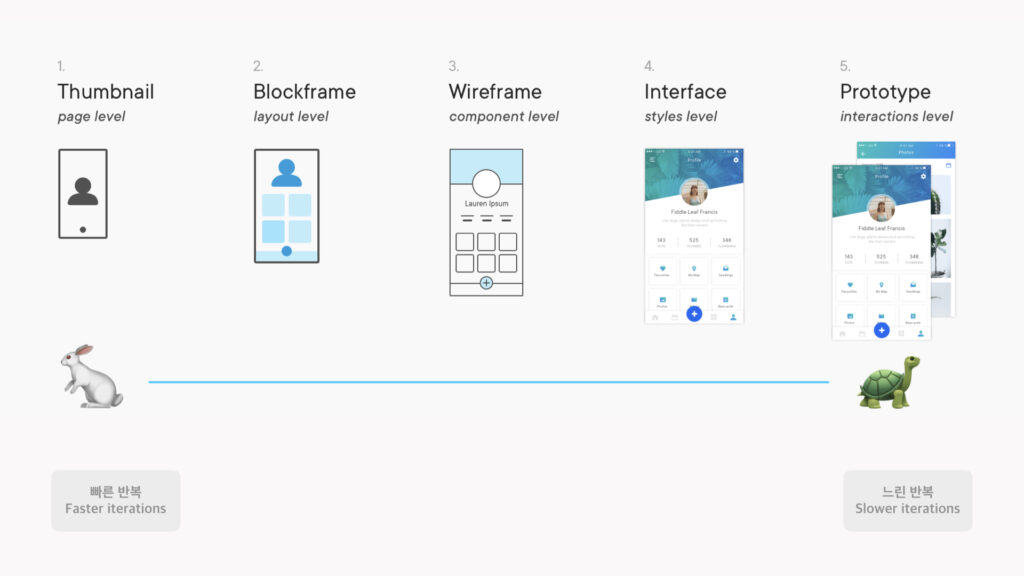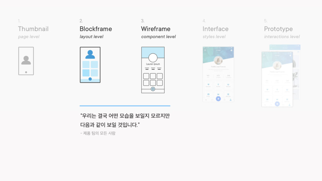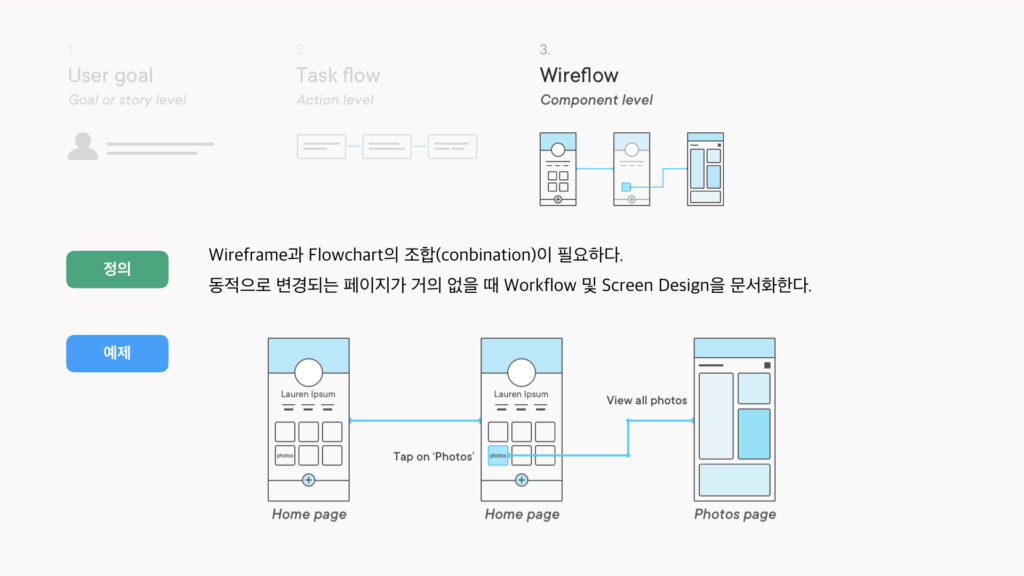 Wireframe은 디자인 접근 방법 중 매우 훌륭한 방법이다. low-fi mockups, blockframes, interfacemonos, wires(와이어 중 하나) 구성하기 위해 Wireframe을 사용하기도 한다.