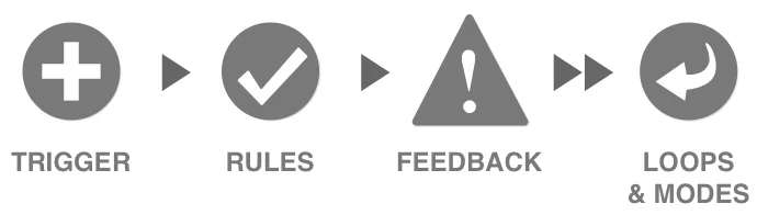 트리거는 마이크로인터랙션을 시작한다. 규칙은 무슨 일이 일어나는지 결정하는 반면 피드백은 사람들에게 무슨 일이 일어나고 있는지 알려준다. 루프와 모드는 마이크로인터랙션의 메타 규칙을 결정하며, 각 부분은 Microinteractions 의 해당 장에서 자세히 설명 한다.