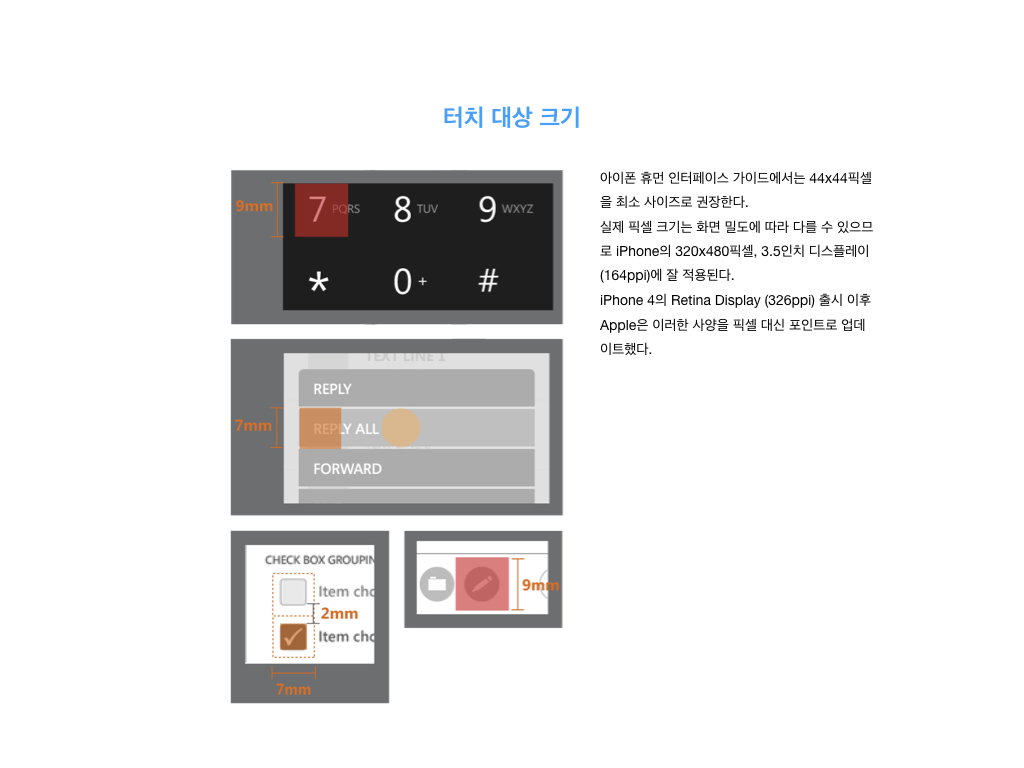 사람들은 손가락으로 터치 기반 사용자 인터페이스와 상호 작용한다. 따라서 사용자 인터페이스 컨트롤은 잘못된 동작과 목표를 가진 사용자를 좌절시키지 않으면서 손가락 끝 동작을 캡처할 만큼 충분히 커야 한다.