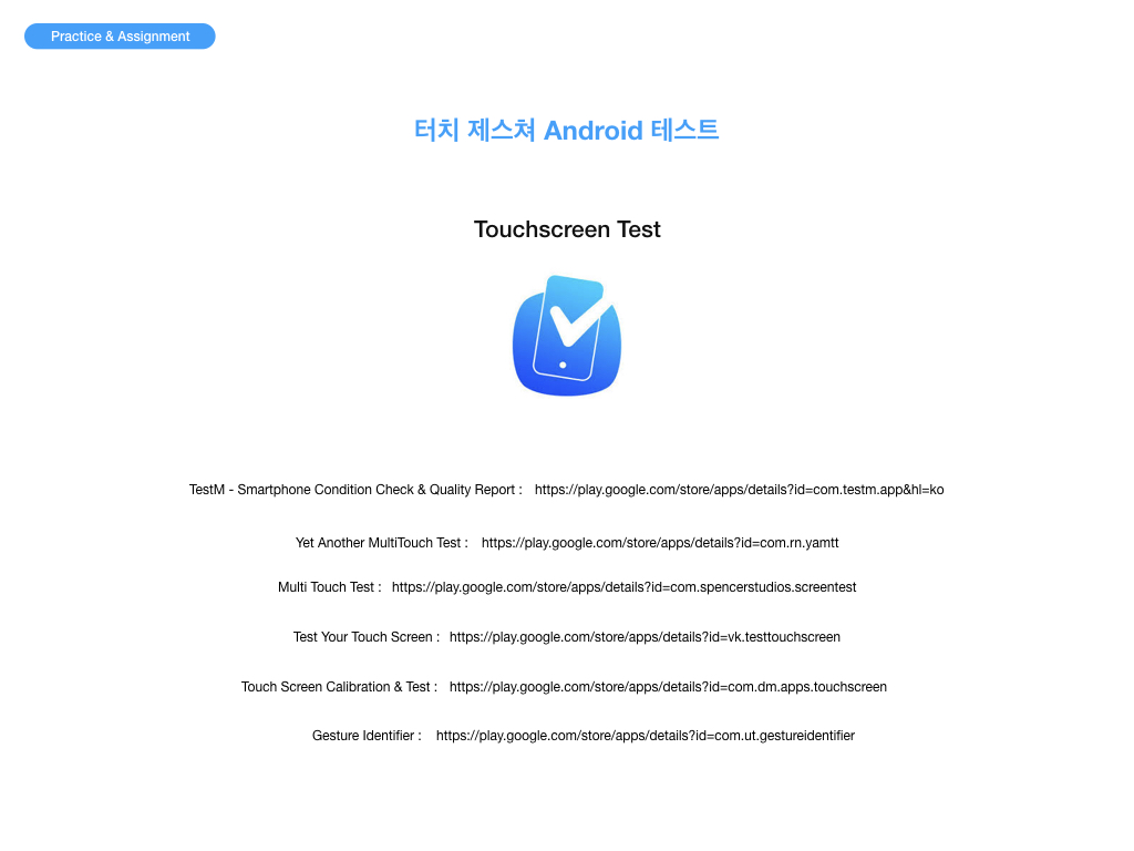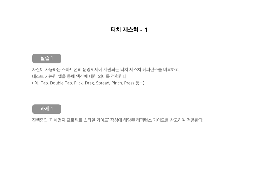 자신이 사용하는 스마트폰의 운영체제에 지원되는 터치 제스쳐 레퍼런스를 비교하고, 테스트 가능한 앱을 통해 액션에 대한 의미를 경험한다.