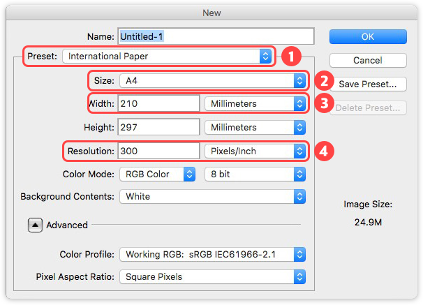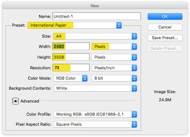 ex) A4(210mmx297mm) –> A4용지에 인쇄용으로 출력하려면 300dpi로 환산 –> 가로 210mm x 300dpi / 2.54 = 2480pixel, 세로 297mm x 300dpi / 2.54 = 3508pixel