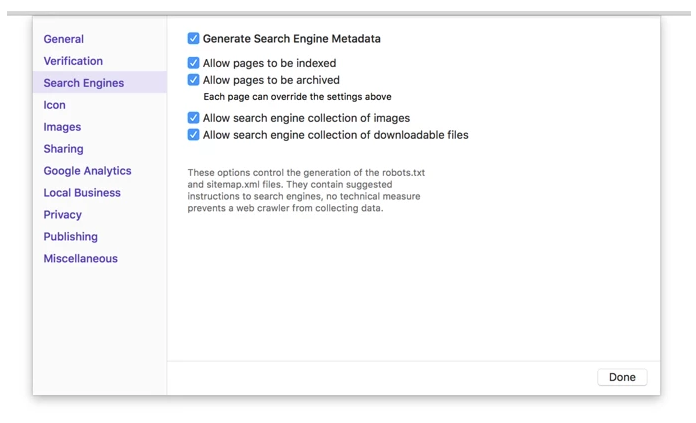 검색 엔진은 소위 “sitemap.xml”이라는 파일을 사용할 수 있다. 이 파일은 검색 엔진 bot에게 사용 가능한 파일이 무엇인지 정확하게 알려주는 파일이다. 웹 사이트에서 이것은 로봇이 볼 수 있는 것과 볼 수 없는 것을 알려주는 “robots.txt” 파일과 짝을 이룬다. 이 설정 창은 Sparkle이 파일을 생성하도록 지시한다. 그러면 파일을 “인덱싱”된 페이지를 세부적으로 제어할 수 있다. 색인 생성(검색 가능) 및 “아카이브”(나중에 사용하기 위해 저장됨)를 검색 엔진에서 검색한다.