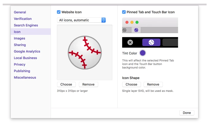 또한 Safari는 고정 탭과 MacBook Pro Touch Bar에 대한 특정 아이콘을 지원한다. 이 아이콘은 마스크로 사용되며 SVG 형식의 벡터 파일이어야 한다. 설정 페이지에서는 고정된 탭과 터치 막대에서 SVG가 어떻게 보이는지 정확하게 미리 볼 수 있다.