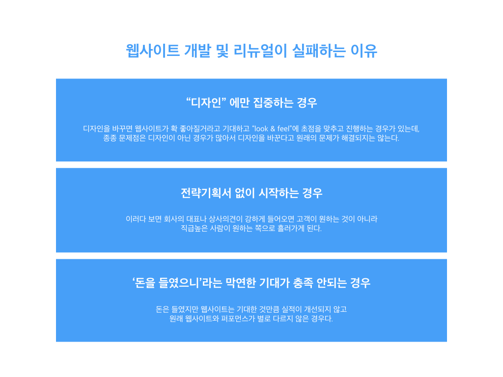 디자인을 바꾸면 웹사이트가 확 좋아질 거라고 기대하고 “look & feel”에 초점을 맞추고 진행하는 경우가 있는데, 종종 문제점은 디자인이 아닌 경우가 많아서 디자인을 바꾼다고 원래의 문제가 해결되지는 않는다.