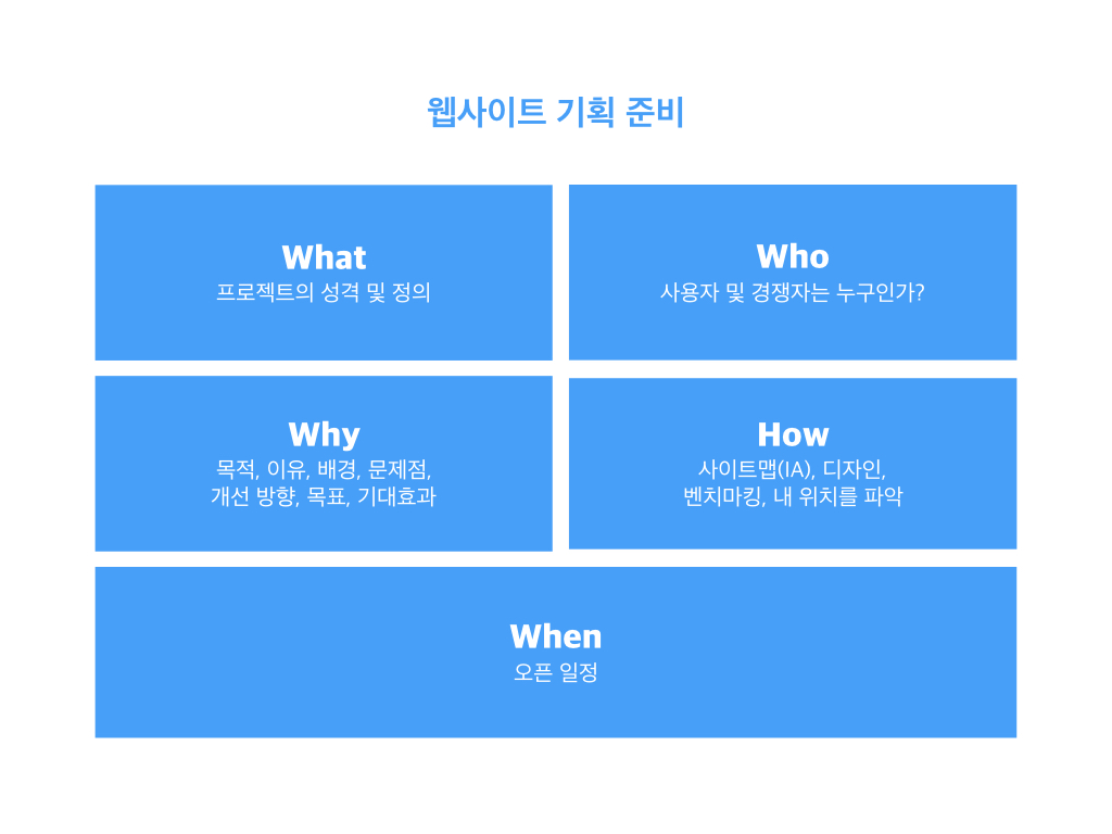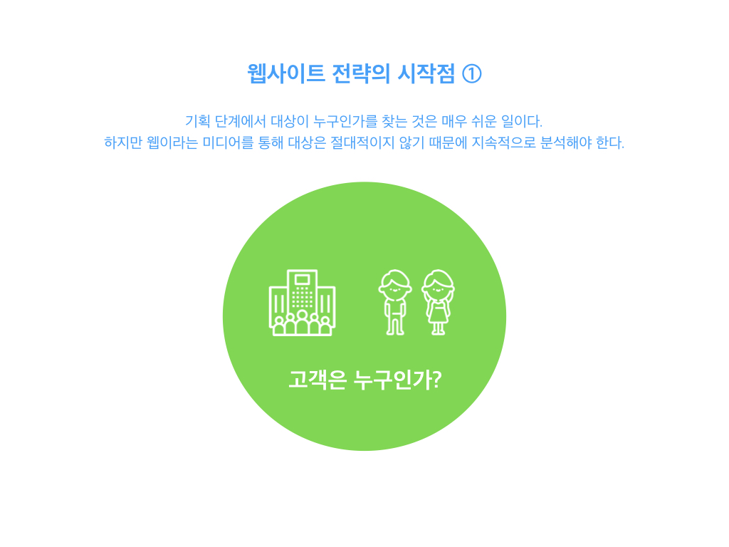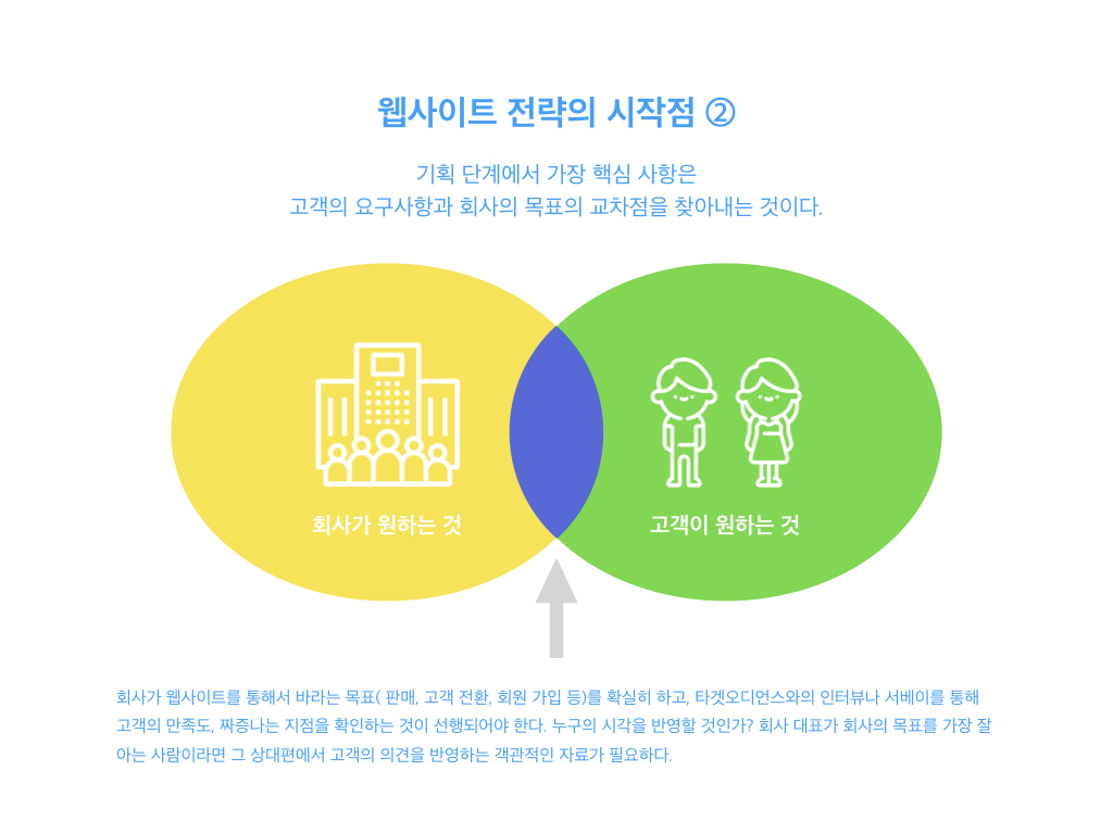 웹사이트 기획 단계에서 가장 핵심 사항은 사용자의 요구와 기업의 목표의 교차점을 찾아내는 것이다. 기업이 웹사이트를 통해서 바라는 목표( 판매, 고객 전환, 회원 가입 등)를 확실히 하고, 타깃 오디언스와의 인터뷰나 조사를 통해 사용자의 만족도, 불편한 지점을 확인하는 것이 선행되어야 한다.