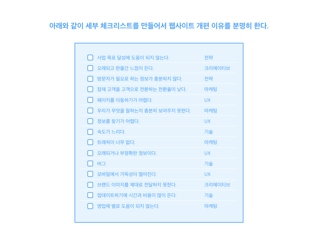 - 웹사이트 진단을 통해 문제점을 확실하게 하라.
