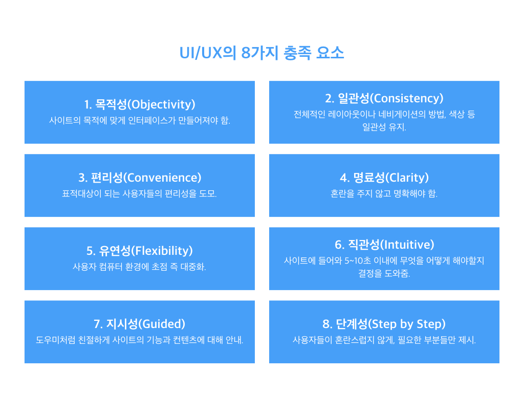- 목적성(Objectivity) : 사이트의 목적에 맞게 인터페이스가 만들어져야 함.