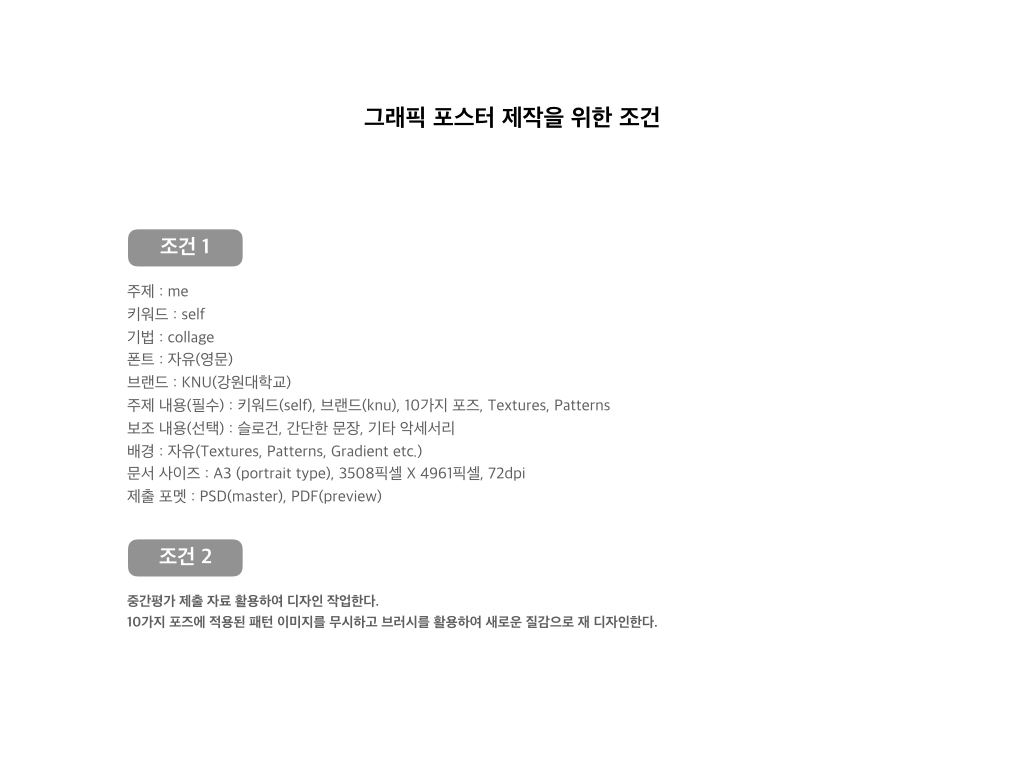 주제 내용(필수) : 키워드(self), 브랜드(knu), 10가지 포즈, Textures, Patterns