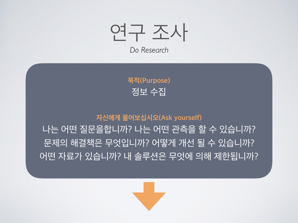 문제가 확인되면 개발자들은 조사를 시행한다. 이 연구에는 개발자의 아이디어를 공식화하고 디자인에 대한 제약 조건을 인식하는 것을 돕기 위해 책, 잡지 또는 인터넷에서 기사를 찾는 것이 포함될 수 있다. 이 단계에서 개발자는 기존 디자인을 검토하여 시작 장소를 제공하고 개발자가 질문을 공식 작성하도록 도울 수 있다. 연구는 개발자들이 디자인의 중요한 요소를 발견하고 탐색하는 단계이기도 하다. 유도된 질문은 성공적인 디자인을 개발하기 위해 해결해야 하는 문제의 측면에 대한 비판적인 사고를 장려한다.