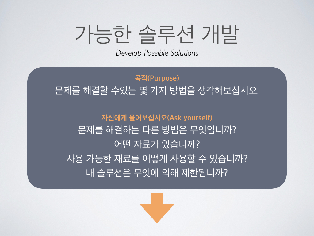 다음으로, 개발자들은 자신이 식별 한 문제를 해결할 수 있는 가능한 설계 솔루션을 브레인스토밍 한다. 가능한 해결책은 동일하거나 다른 재료를 사용하는 한 디자인의 변형을 포함할 수 있다. 또한 완전히 다른 디자인을 포함할 수도 있다. 이 단계에서는 개발자들이 각 디자인의 장단점을 인식할 수 있다.