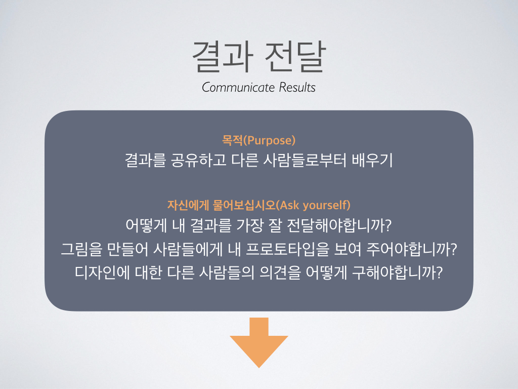 결과 공유는 개발 중인 설계에서 중요한 단계이다. 개발자들은 결과를 전달하기 위해 다양한 방법을 사용하는 것이 좋다. 예로는 스케치, 사진, 상세한 다이어그램, 단어 설명, 포트폴리오, 컴퓨터 시뮬레이션, 컴퓨터 슬라이드쇼 및 비디오 프레젠테이션이 포함된다.