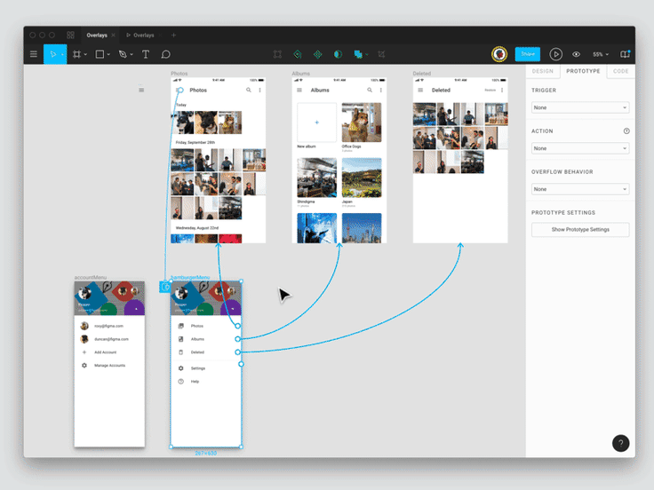 오늘 우리는 프로토타입이 피그마(Figma)에서 훨씬 더 재미있어졌다. Figma의 새로운 오버레이(Overlay) 기능을 사용하면 다른 콘텐츠 위에 유연하게 콘텐츠를 표시하고 상호작용하며 여러 오버레이를 열 수 있다.