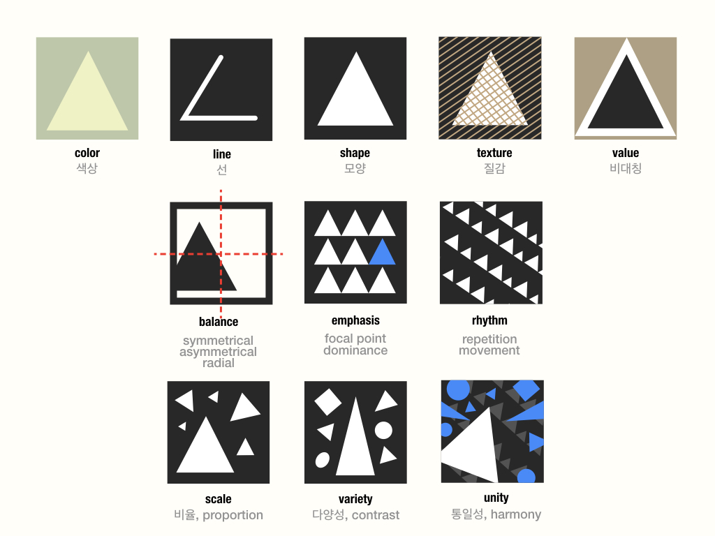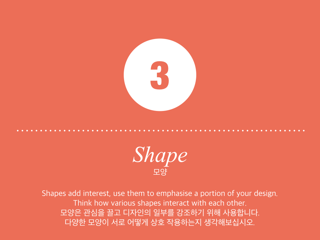 모양은 관심을 끌고 디자인의 일부를 강조하기 위해 사용한다. 다양한 모양이 서로 어떻게 상호 작용하는지 생각해보자.
