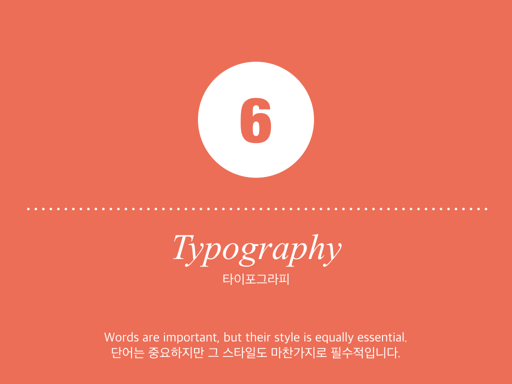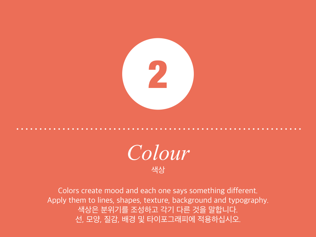 색상은 분위기를 조성하고 각기 다른 것을 말한다. 선, 모양, 질감, 배경 및 타이포그래피에 적용하는 것이 좋다.